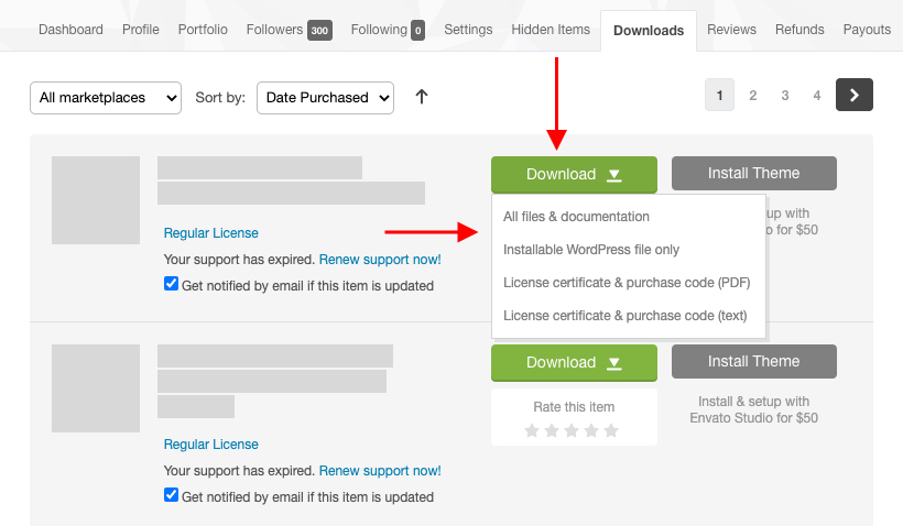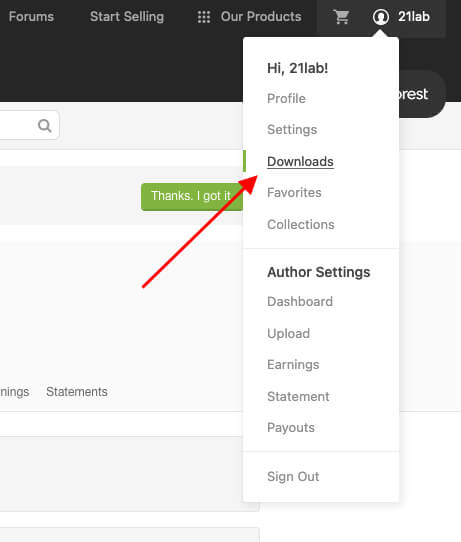 After purchasing, please download the package from ThemeForest. All you need to do is moving your mouse over your login name at the right top corner – after you log in ThemeForest, and then click Downloads.