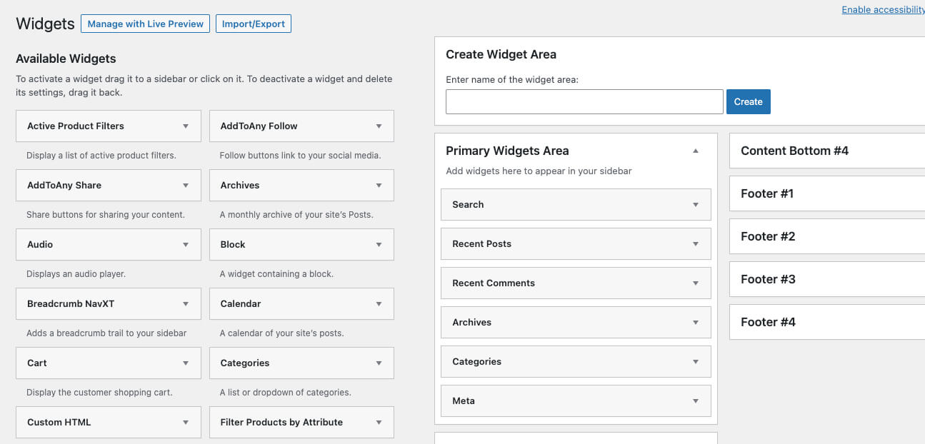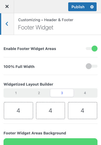 - Footer #1 to #4: This areas will be used to display footer widgets