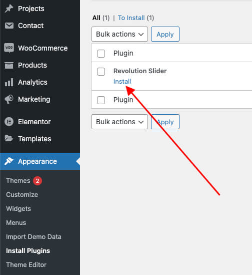 Step 3: Navigate to Appearance > Install Plugins on admin sidebar, then re-install Revolution Slider