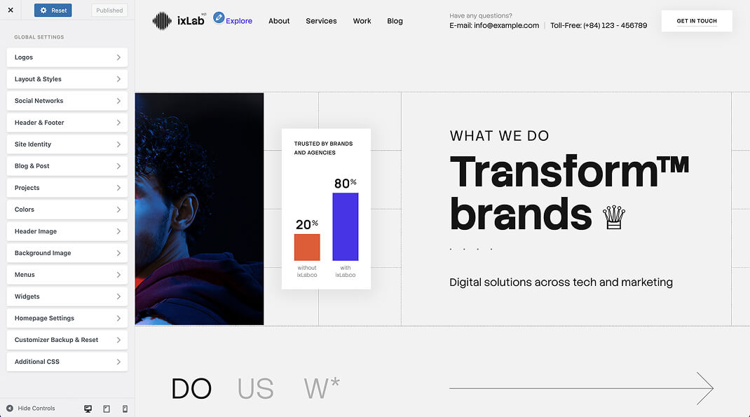 Go to Appearance > Customize on admin sidebar to access the setting options. See below for screenshot of our Customize panel.