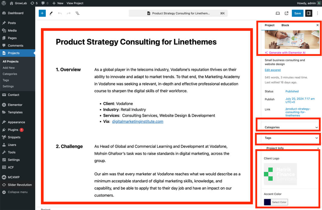 Step 2: Add the Content, Gallery, Category, Featured Image and Client Info... of Project you need in the box.