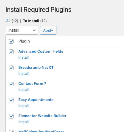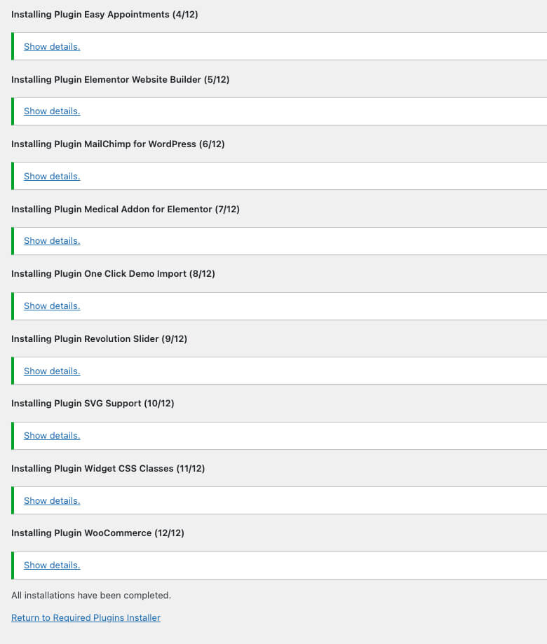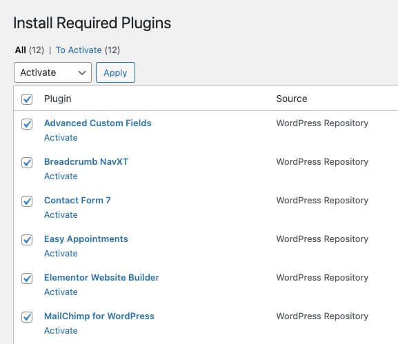Next, click Return to Required Plugins Installer or go to Appearance > Installed Plugins check all of theme and from the drop down select Activate and hit Apply