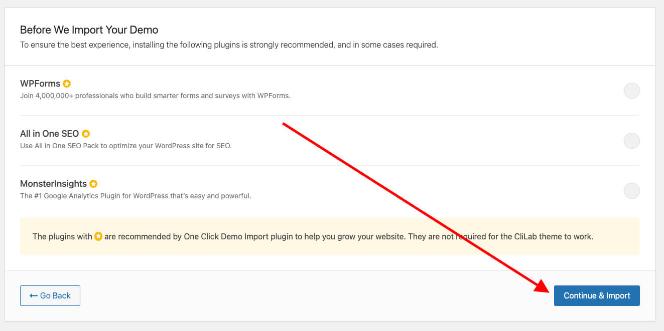 Next, Confirm the import demo you wish to proceed with. Click Continue & Import