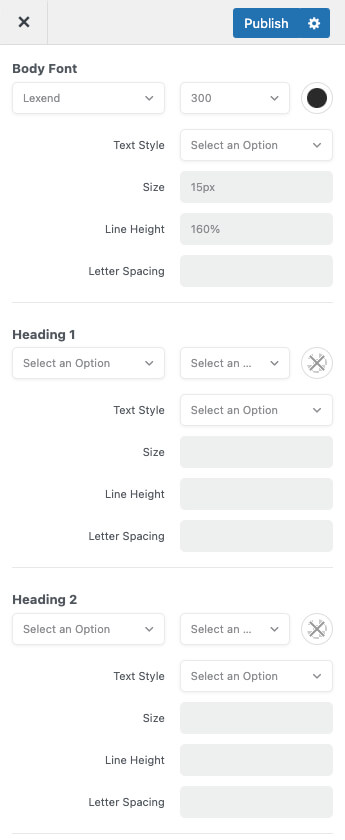 Now you can select the font family, color, size or weight for the Body text, Heading text, Blockquote text.