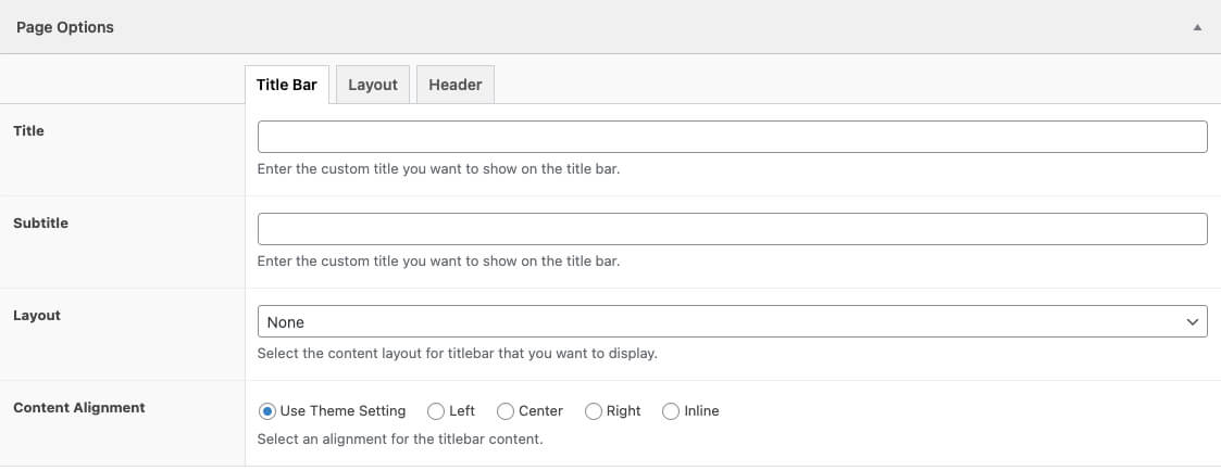 Layout: Select the content layout for titlebar that you want to display: Default, Page Title and Breadcrumbs, Page Title Only, Breadcrumbs Only and None (Disable).