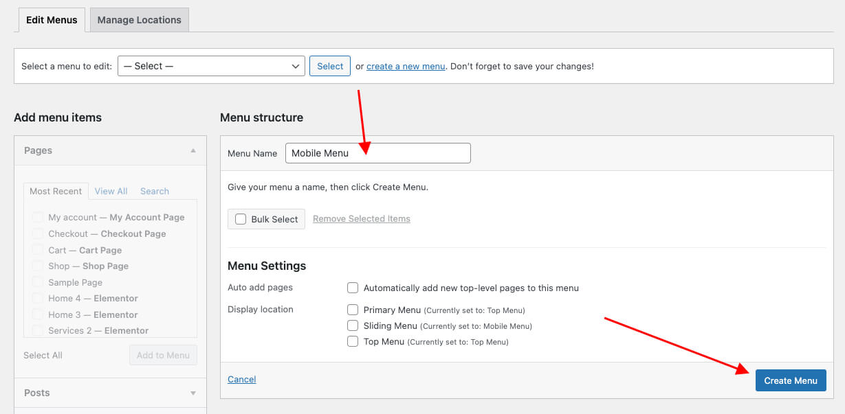 Step 1: Navigate to Appearance > Menus in your admin sidebar and click Create a new menu option.