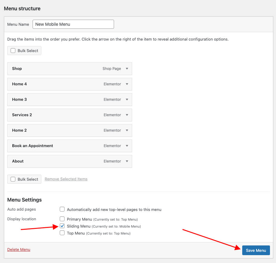 Step 4: Choose display location is Sliding Menu and hit Save Menu.