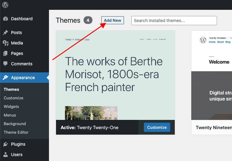 Step 2: Click Add New, then click Upload Theme > Choose File