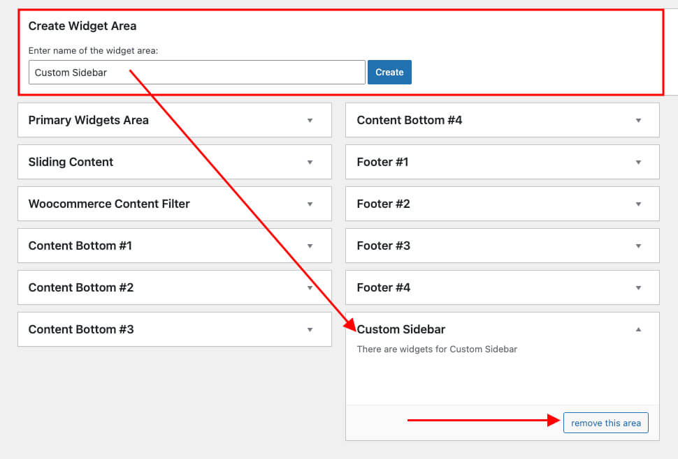 Beside the built-in sidebar areas, we provide a feature called Custom Sidebar. With this feature, you can create unlimited sidebar areas. To create a custom sidebar, just navigate to Appearance > Widgets you will see the box Create Widget Area on the right. Please enter the sidebar title as you want and click to Create button, a custom sidebar will be created.