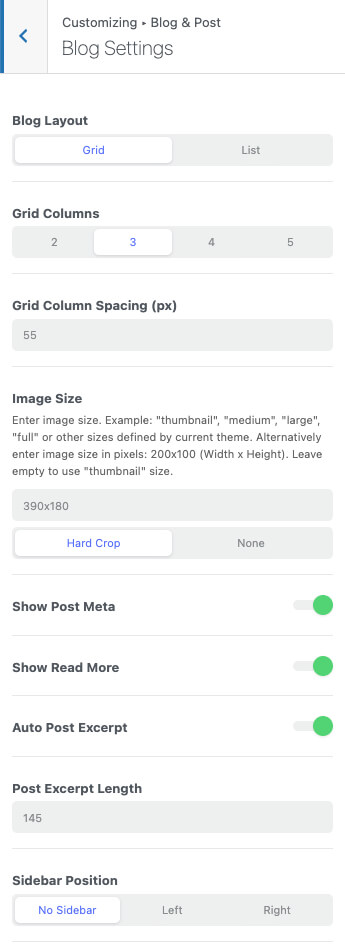 Grid Column Spacing: Sets the Gaps (gutters) between Columns (if you select Blog Layout Grid).