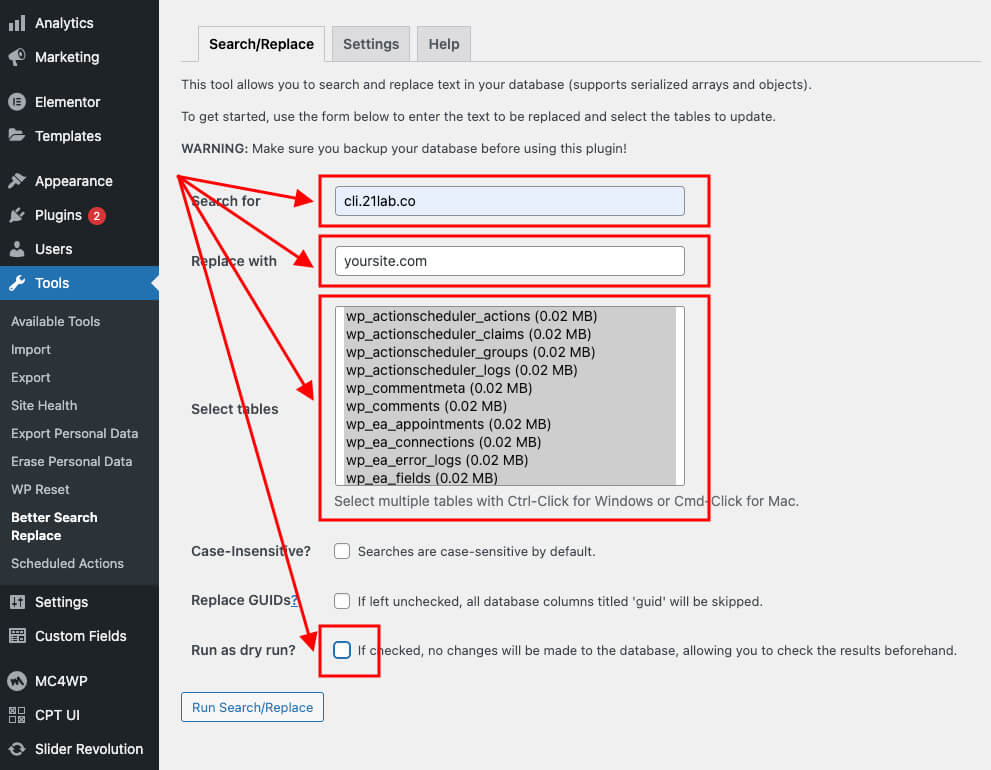 Step 1: Navigate to Elementor > Tools switch to tab Replace URL