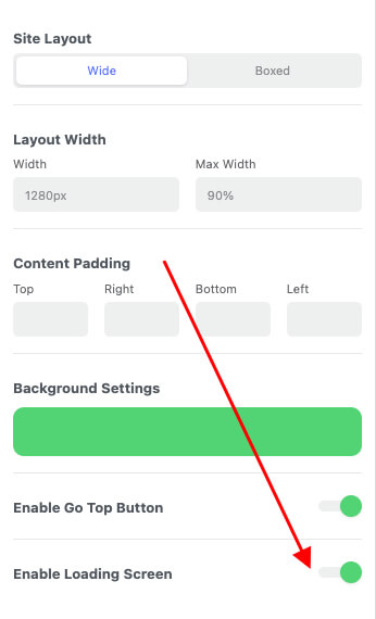 Navigate to Appearance > Customize > Layout & Styles > Layout Setting then Enable Loading Screen