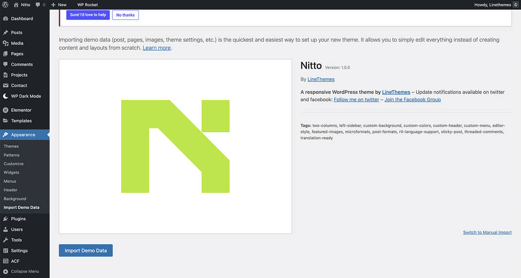 Our demo data import lets you have the whole data package in minutes, delivering all kinds of essential things quickly and simply. All you need to do is to navigate to Appearance > Import Demo Data. Hit Import Demo Data.