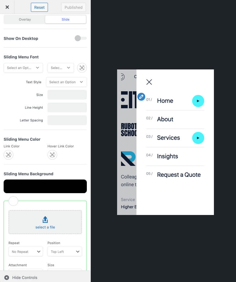 Navigate to Appearance > Customize > Layout & Styles > Sliding Menu
